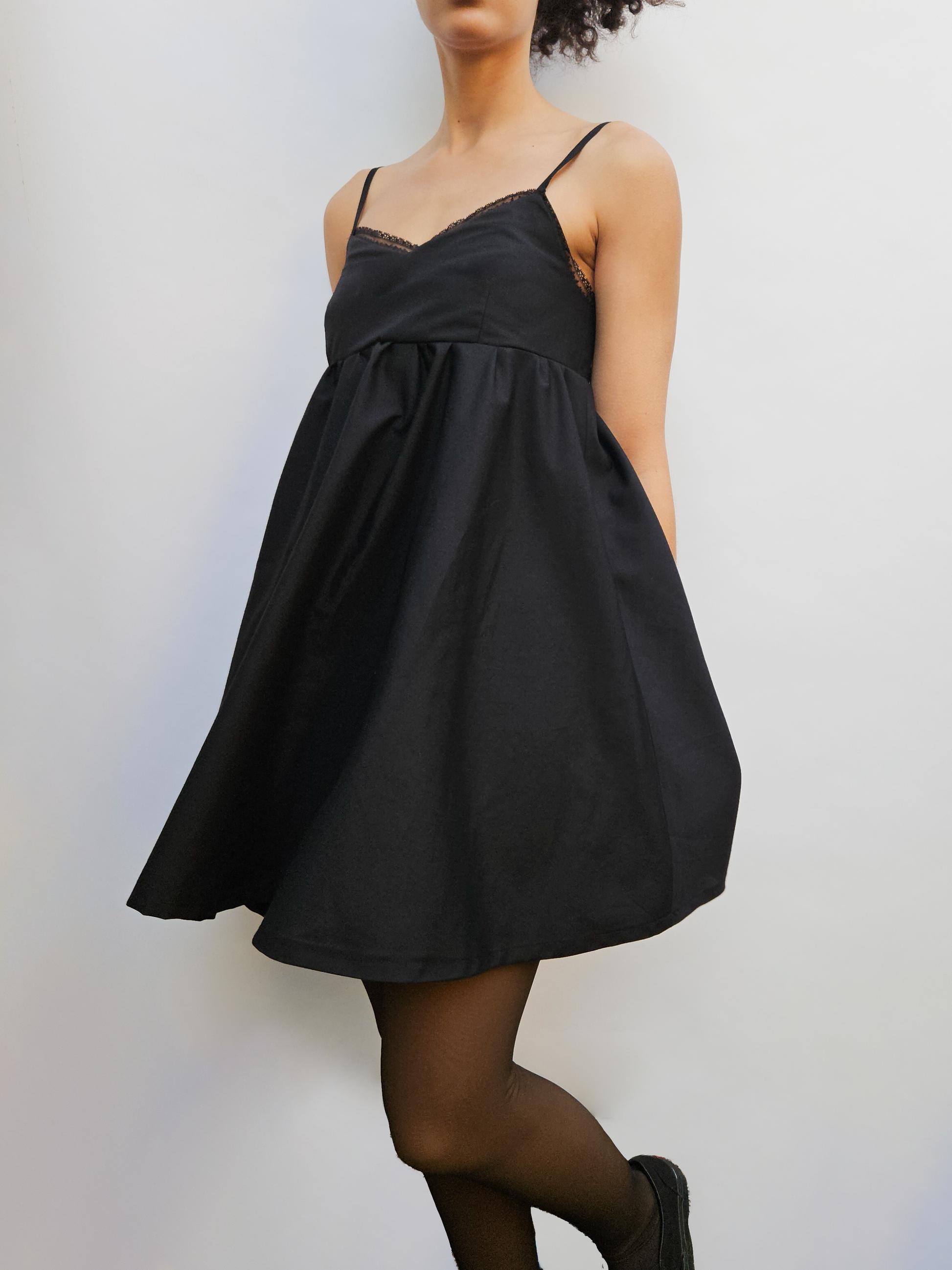 This dress is a pattern great for beginner to intermediate sewers! This is a mini length with a gathered empire waist. This pattern requires woven fabric and an optional lace or ruffle trim.