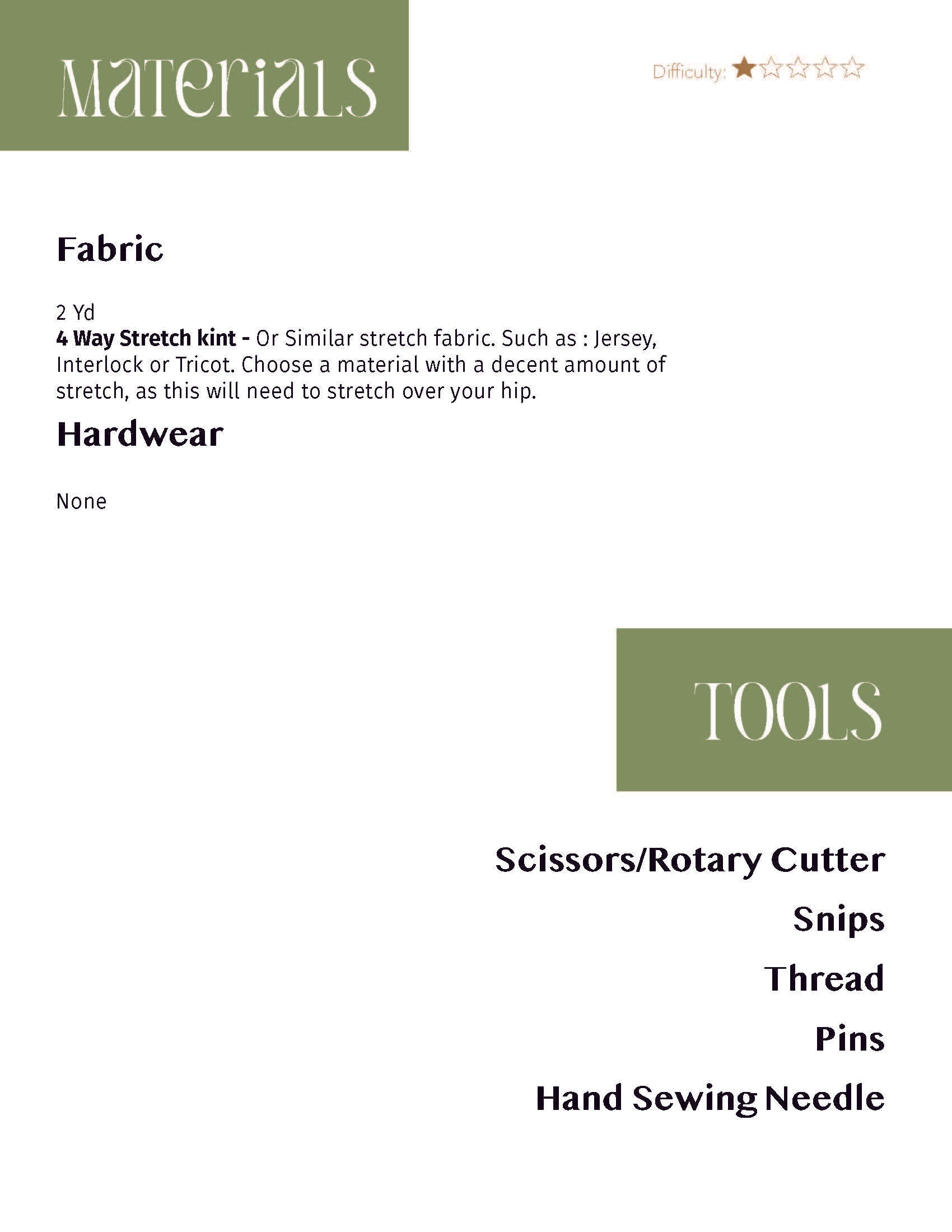 This skirt is a simple pattern great for beginners! This is a mini length with a mid/high rise fit. No zipper needed, this sewing pattern uses stretch fabric.
